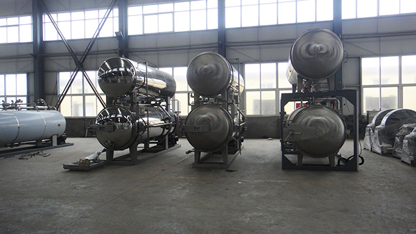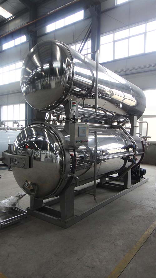 杀菌锅在杀菌时,由于加热使罐头温度升高,罐头内压力会超过罐外(在锅内)的压力。因此,为了避免杀菌时玻璃瓶罐内增压而跳盖,对马口铁罐两端面凸出,施加反压力,特别是对需要较高杀菌温度的肉类罐头更就如此。 使用反压力杀菌,即是用压缩空气通入锅内增加压力,防止罐头凸罐和跳盖,其操作情况分述如下:由于压缩空气是不良导热体,况蒸汽本身又具有一定的压力。因此,在杀菌时升温过程中,不放进压缩空气,而只在达到杀菌温度后处于保温时,才开放压缩空气入锅内,使锅内增加0.5-0.8.个大气压。特经过杀菌后,降温冷却时,停止供应蒸汽,将冷却水压入喷水管。