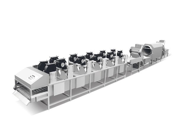 本机用来除去经过清洗消毒过后物料中多余的水分,方便物料后续的包装及配送。本机主要与切菜、洗菜设备组合成连续式净菜加工生产线,节省大量人力;操作简单,生产安全卫生,大幅度提高生产效率。不锈钢输送速度可无极调速度,风机高度可调节。